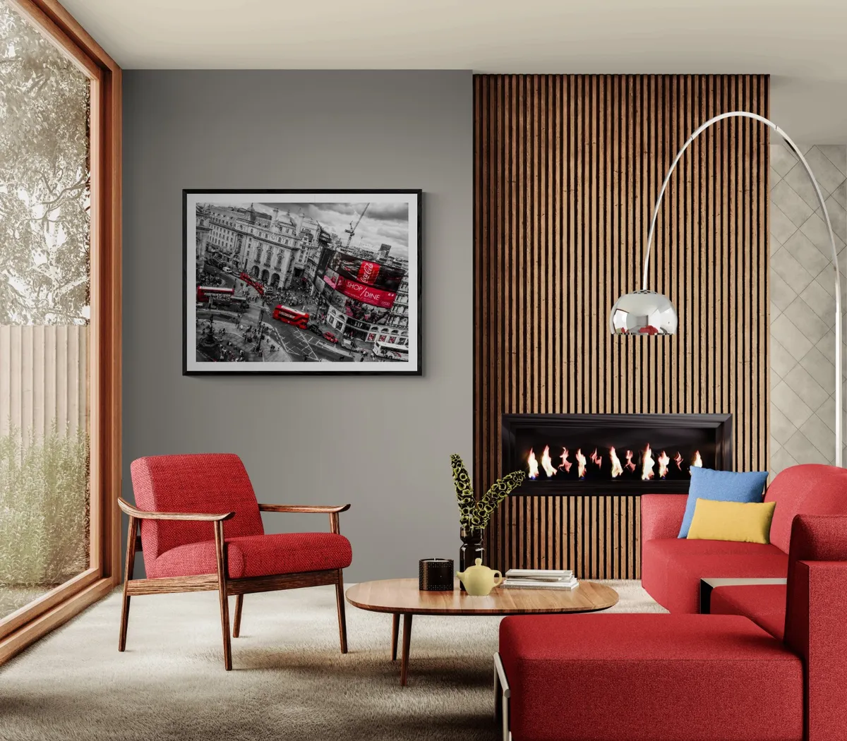 An aerial view of London’s bustling Piccadilly Circus captures the dynamic essence of the city. The famous red double-decker buses navigate the busy intersection, surrounded by historic buildings and modern digital billboards. The red elements stand out vividly against the black-and-white backdrop, emphasizing the city's vibrant energy and iconic landmarks. The scene is a blend of old and new, showcasing London’s unique character.