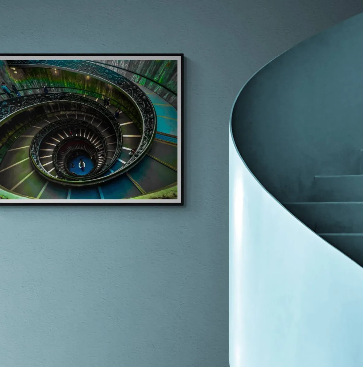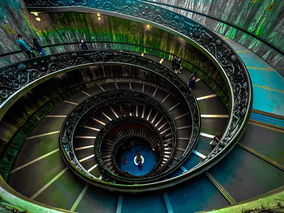 A stunning spiral staircase showcasing the intricate design and symmetry of this architectural marvel. The vibrant colors and detailed craftsmanship create a visually striking and captivating view.