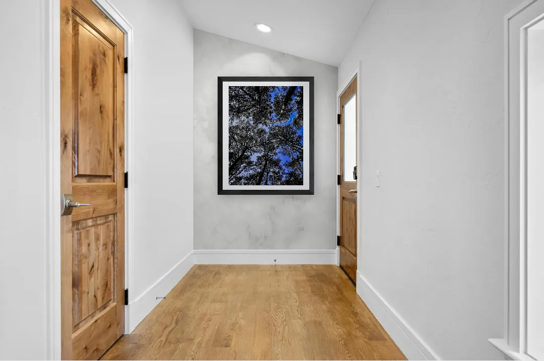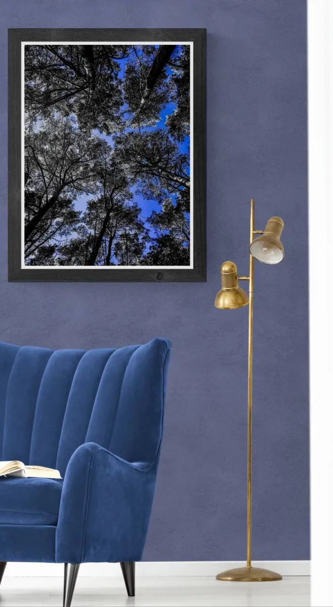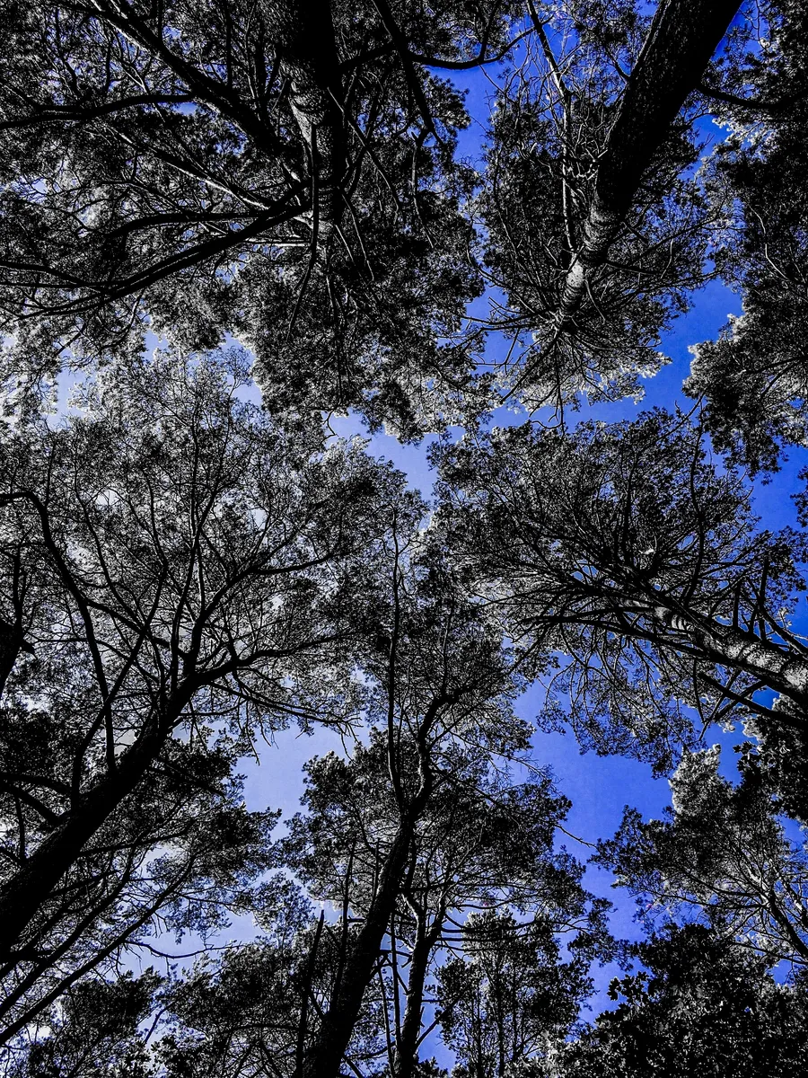 Looking up at a forest canopy, the dense branches and leaves form intricate patterns against a bright blue sky. The trees appear as silhouettes, creating a striking contrast between the dark foliage and the vivid sky above.