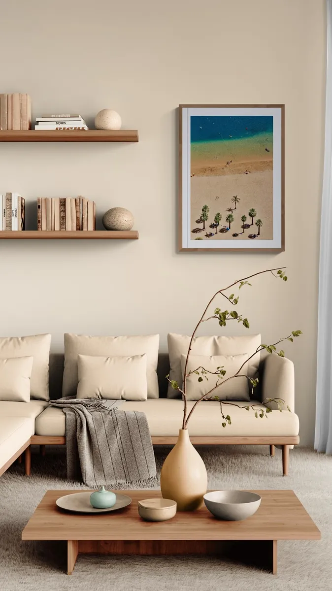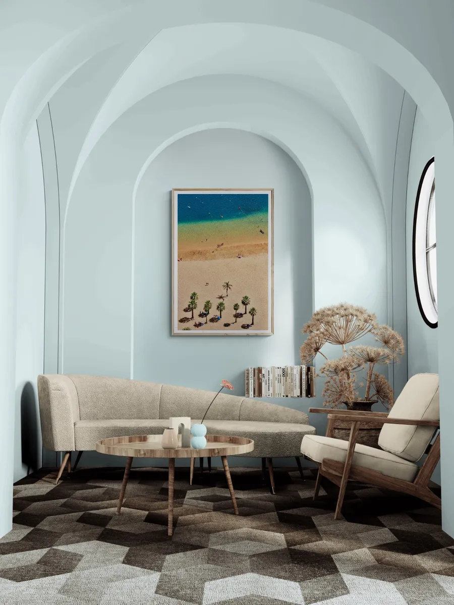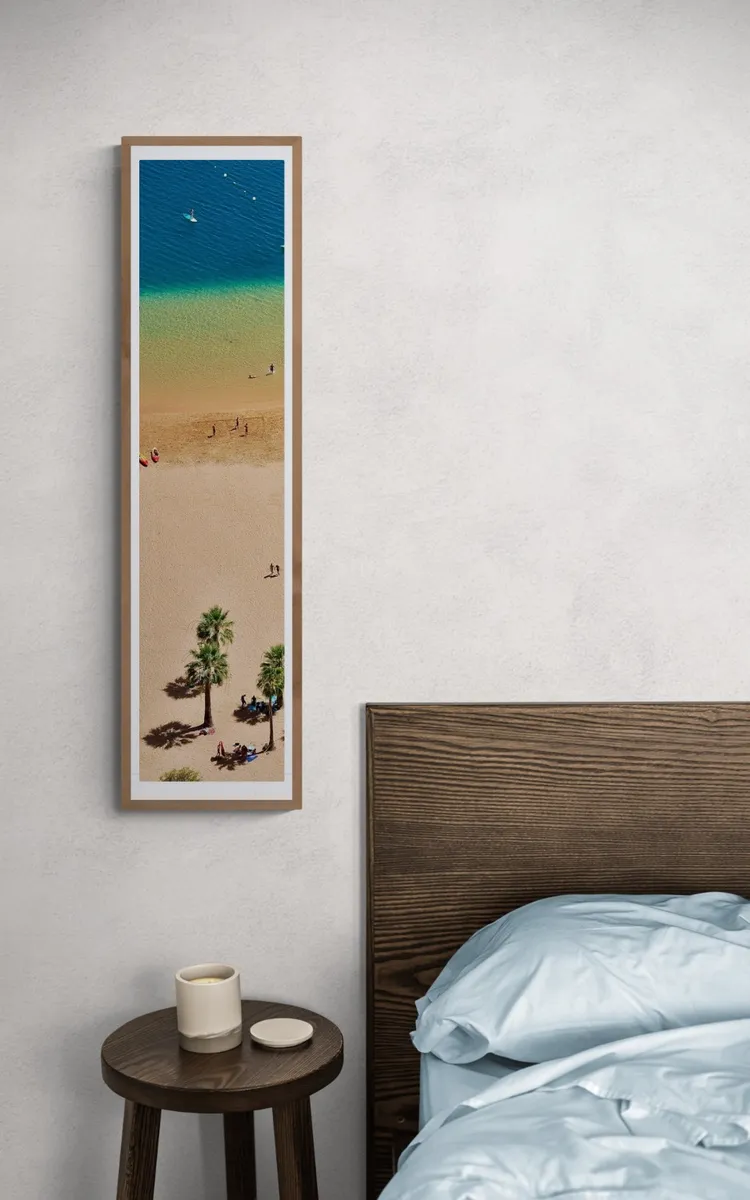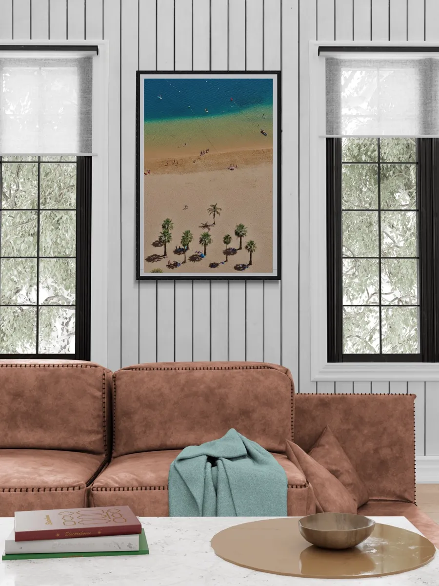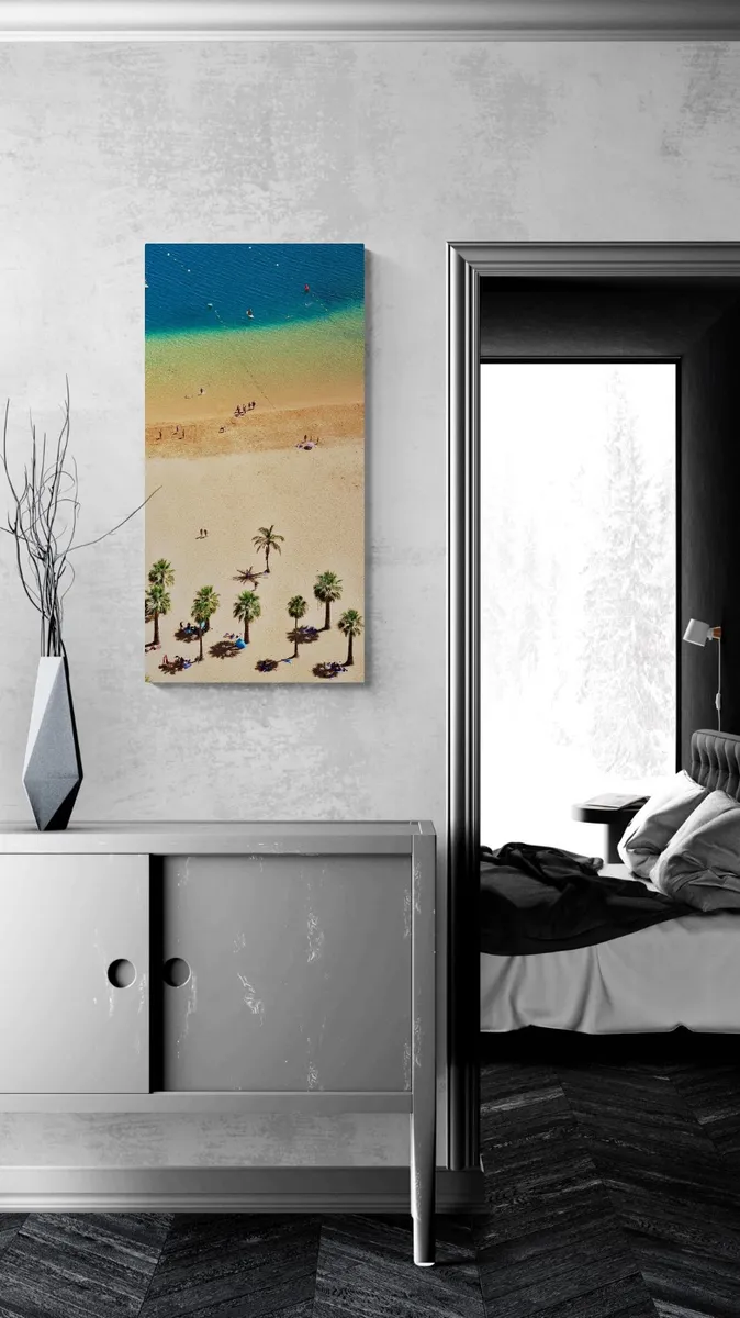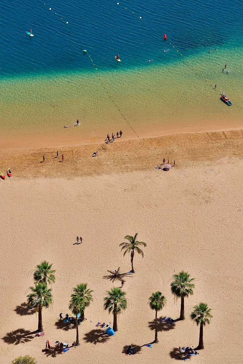 Capturing the essence of a perfect beach day, this aerial shot highlights the striking contrast between the golden sands and the turquoise waters. The composition showcases the beach's tranquil environment, with palm trees providing shaded areas and beachgoers leisurely scattered along the shore. The clear demarcation between the shallow, inviting waters and the deeper blue of the ocean adds depth to the image, while the overall scene exudes a sense of relaxation and escape.