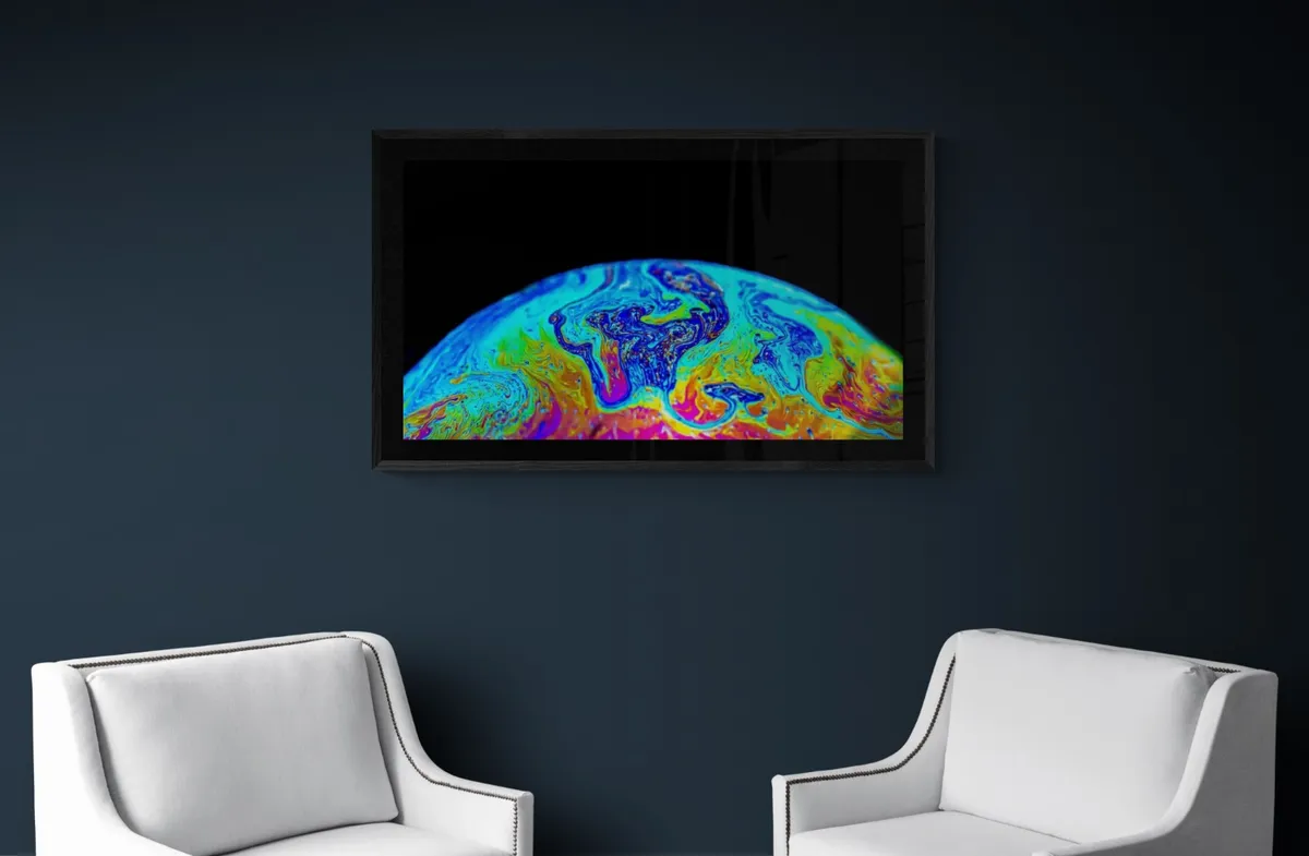 Capturing this image was like exploring a tiny, vibrant cosmos through the lens of my camera. The striking colors you see were created naturally by a soap bubble, illuminated under controlled lighting to enhance their vividness. The blues, yellows, and magentas flow into each other, creating patterns that remind you of planetary surfaces seen from space. This shot, a mix of art and science, showcases the fascinating beauty of fluid dynamics and color theory in a simple soap bubble.