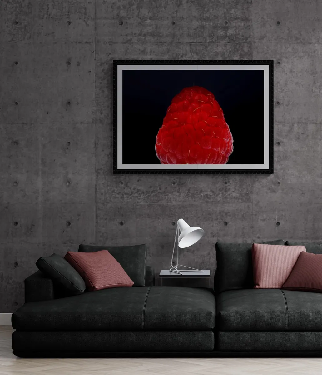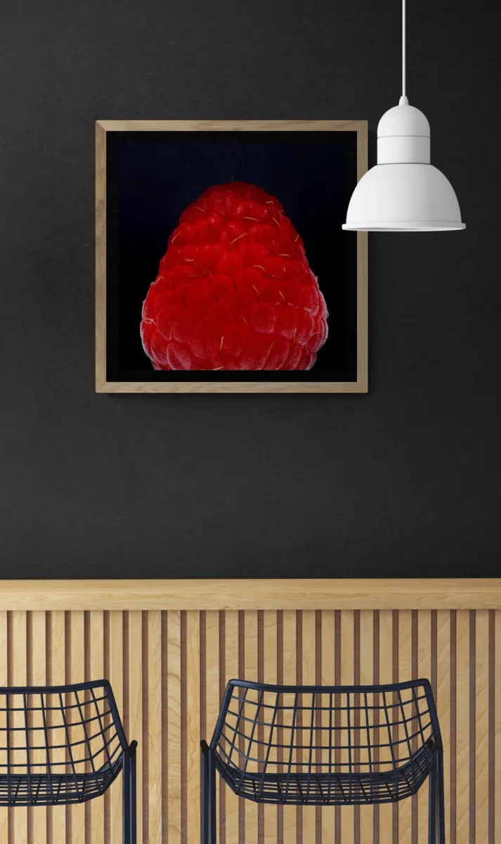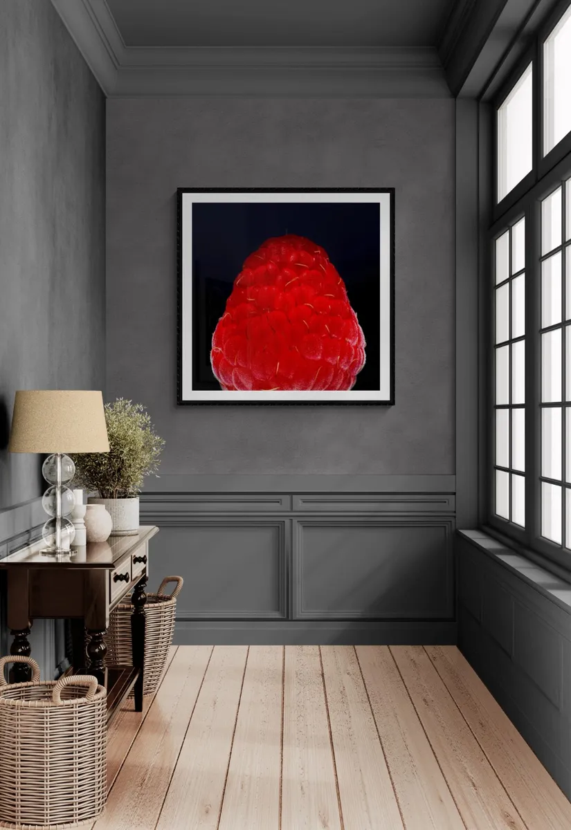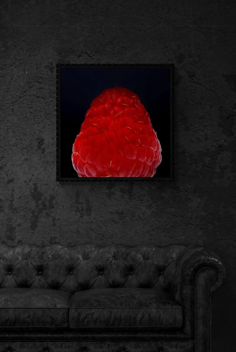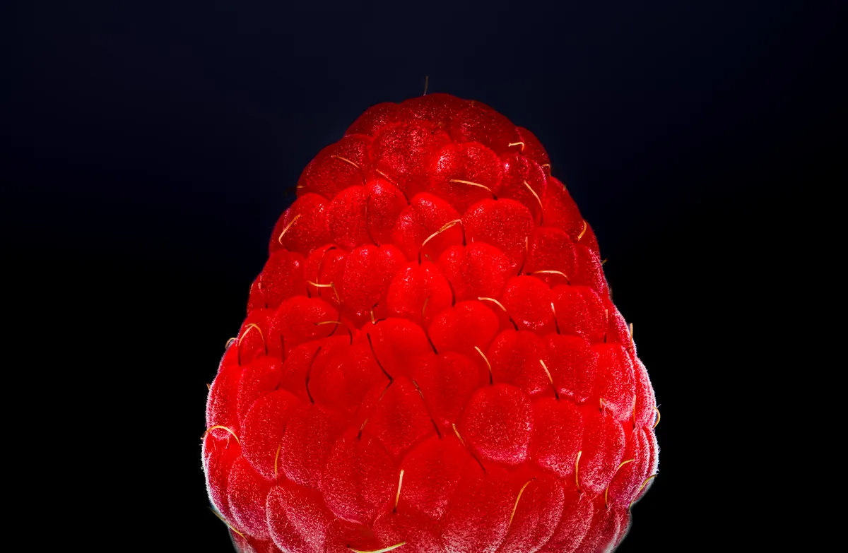 A vibrant close-up of a raspberry, showcasing the intricate texture and vibrant red hue of its drupelets against a deep, dark background. Each tiny hair and surface detail is clearly visible, emphasizing the raspberry's rich, natural appeal and its delicate structure.