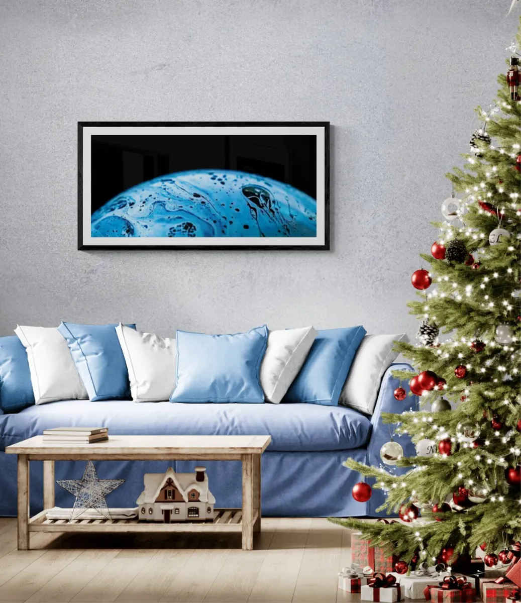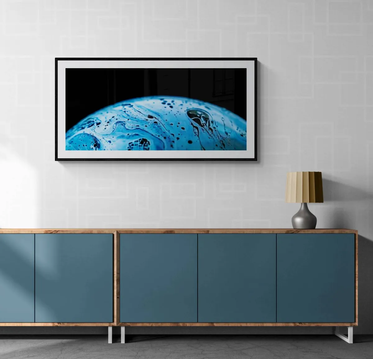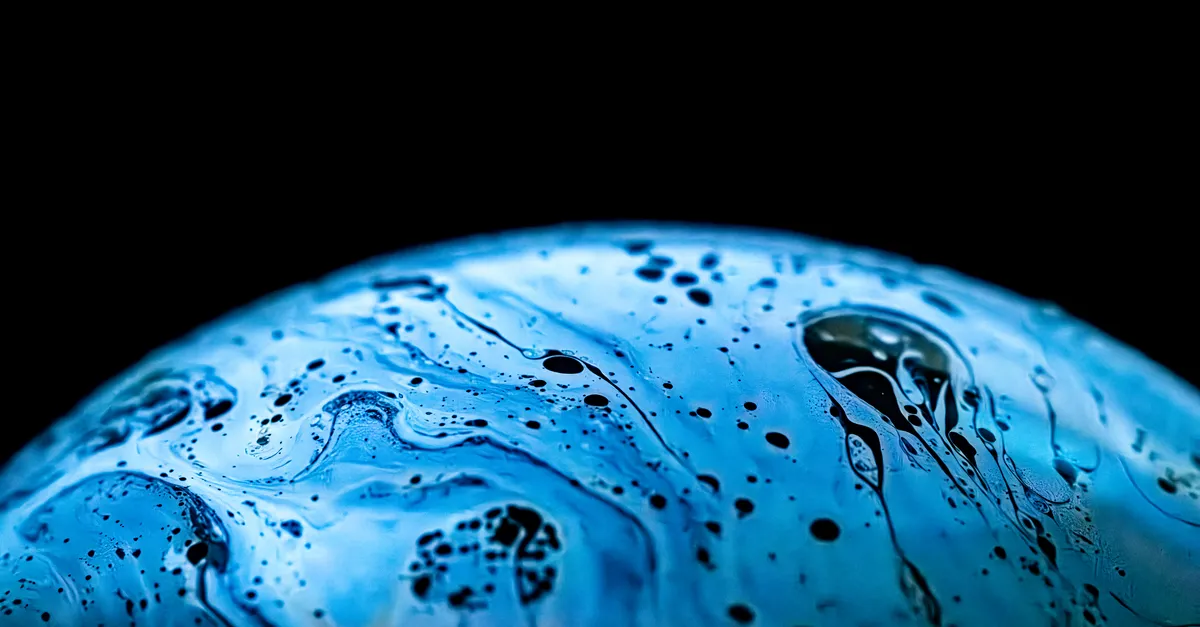 This macro photograph transforms a simple soap bubble into a mesmerizing world of swirling blue hues and intricate patterns. The dynamic textures and dark accents evoke the appearance of an alien planet or a distant celestial body, inviting viewers to explore the beauty hidden in everyday details. Through the lens, a fleeting moment becomes a timeless glimpse into the artistry of physics and light.